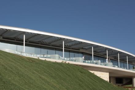 The clubhouse at the Bay Course in Costa Navarino is built into the earth. It features breathtaking views and outdoor dining in a luxury resort setting.