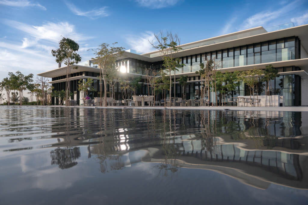 The modern aesthetic begins at the front guardhouse, where clean-lined landscaping and water features set a welcoming tone. The two-level, 26,000-square-foot clubhouse is positioned with its main entrance on the upper level to take advantage of elevated views.