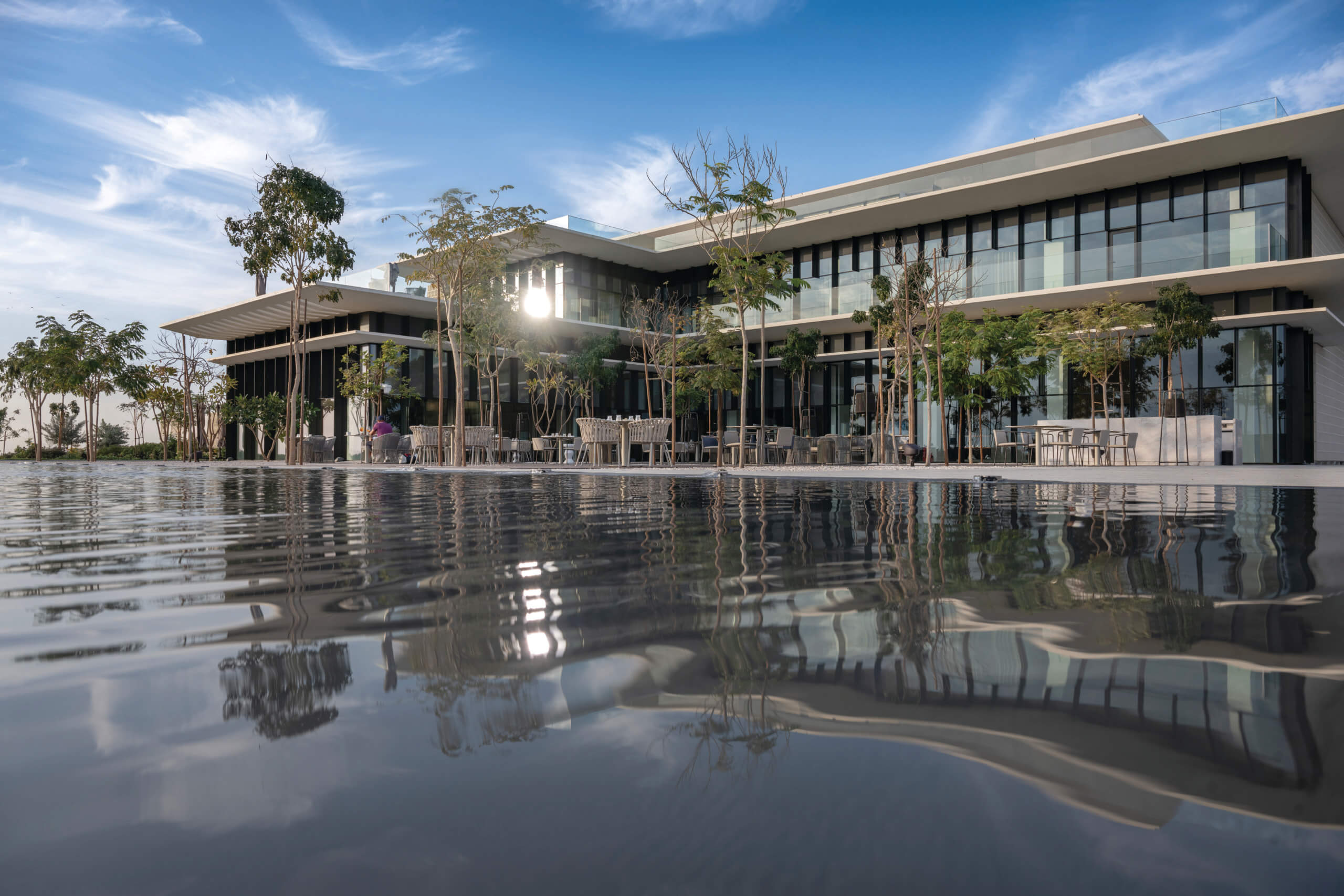 Al Zorah Golf & Yacht Club’s new clubhouse blends natural topography with architectural form to create a fluid, engaging experience. Built on a previously flat site, the building introduces vertical movement and layered spaces, rising in terraced steps to a rooftop terrace with sweeping views.