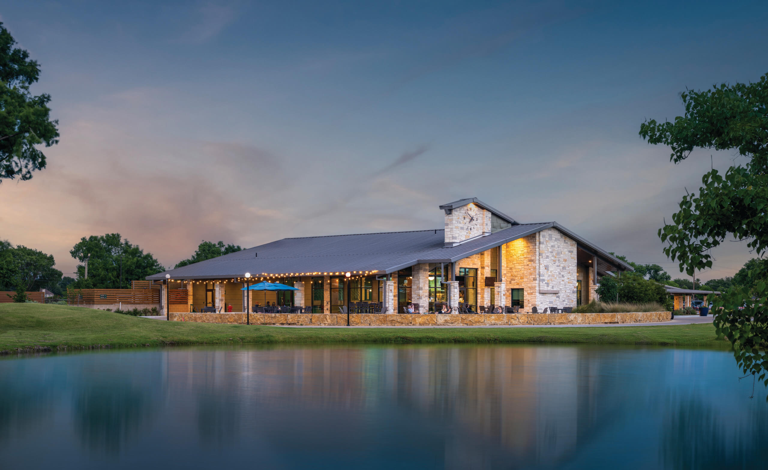 Though compact, the building includes a golf shop, bar and grill, restrooms and cart storage. It also features a fireplace, outdoor firepits, exterior televisions, two lawn areas — one with a stage and one by the lake — and a covered patio used for cart staging during the day.