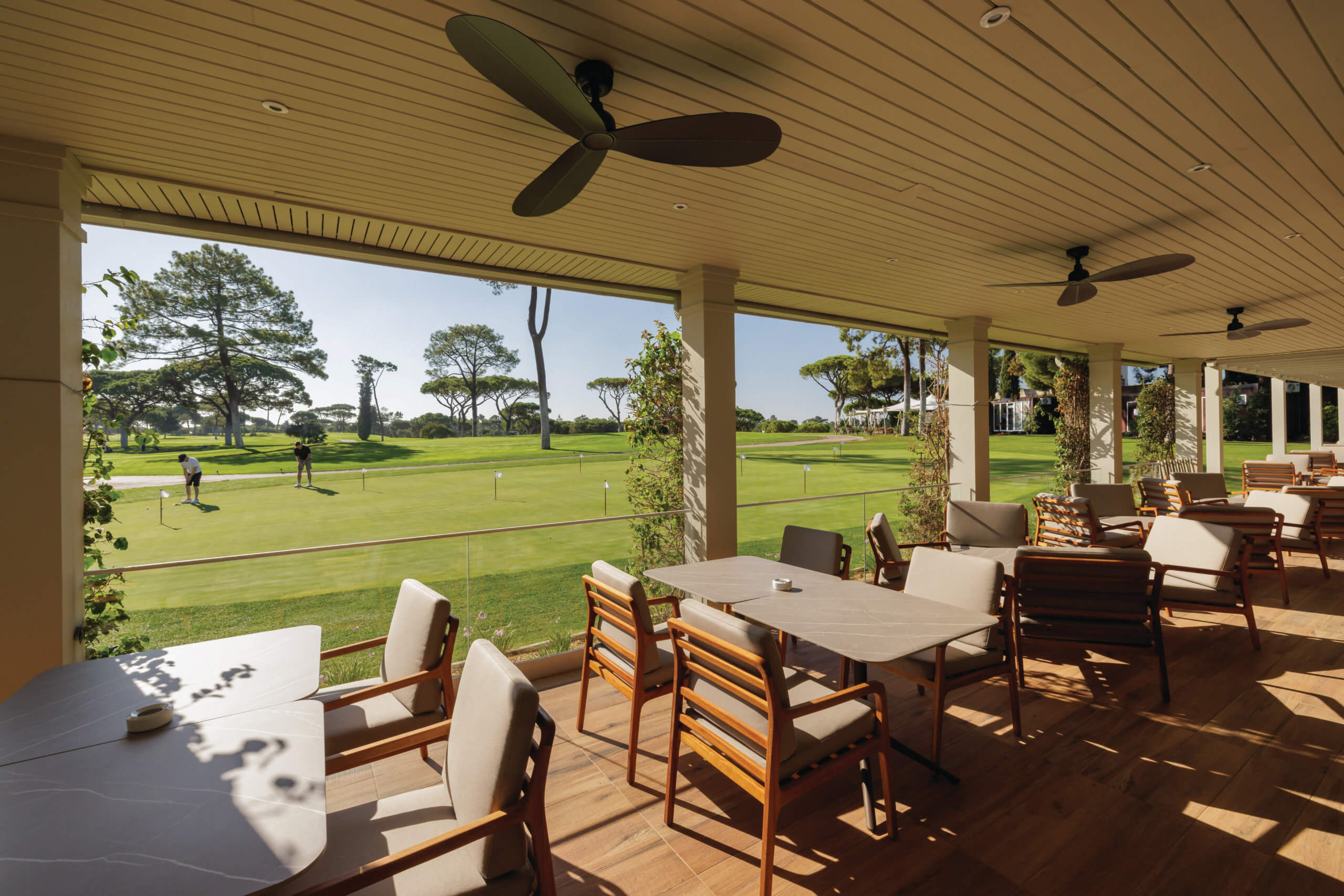 Efficiency was a key goal. The proximity of main service areas allows staff to maintain high service standards across spaces. Outside, the terrace offers panoramic views of holes 1 and 18, with clear sightlines to the driving range, buggy house and arrival area to help guests orient themselves quickly.