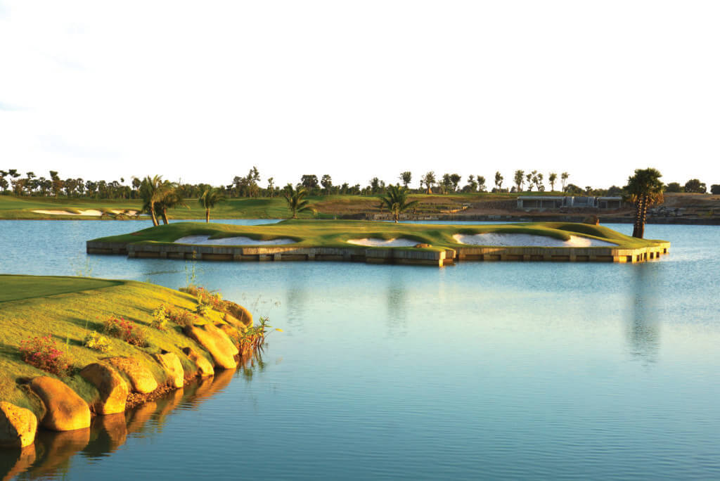 The resort integrates many elements of Cambodian culture into the design. The rumdoul, the national flower, is represented in the shape of the clubhouse. Native sugar palm trees are in abundance on the Palm course and are also featured in the garden-like landscape of the Lake course. Both courses end at the 19th hole, whose island green is in the shape of Cambodia.