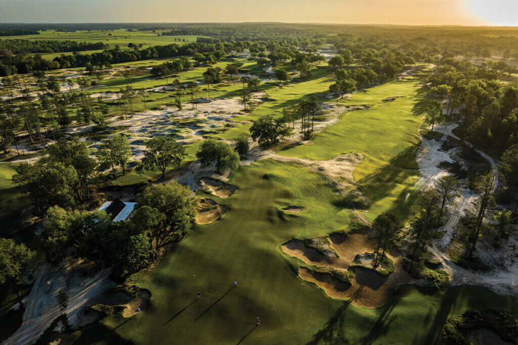 The Roost course features canopies of moss-draped trees and sandy soil in a tranquil setting that takes golfers back in time. It flows across sandy scrubland and rolling meadows with numerous 50-foot elevation changes and a 40-foot-deep sinkhole.