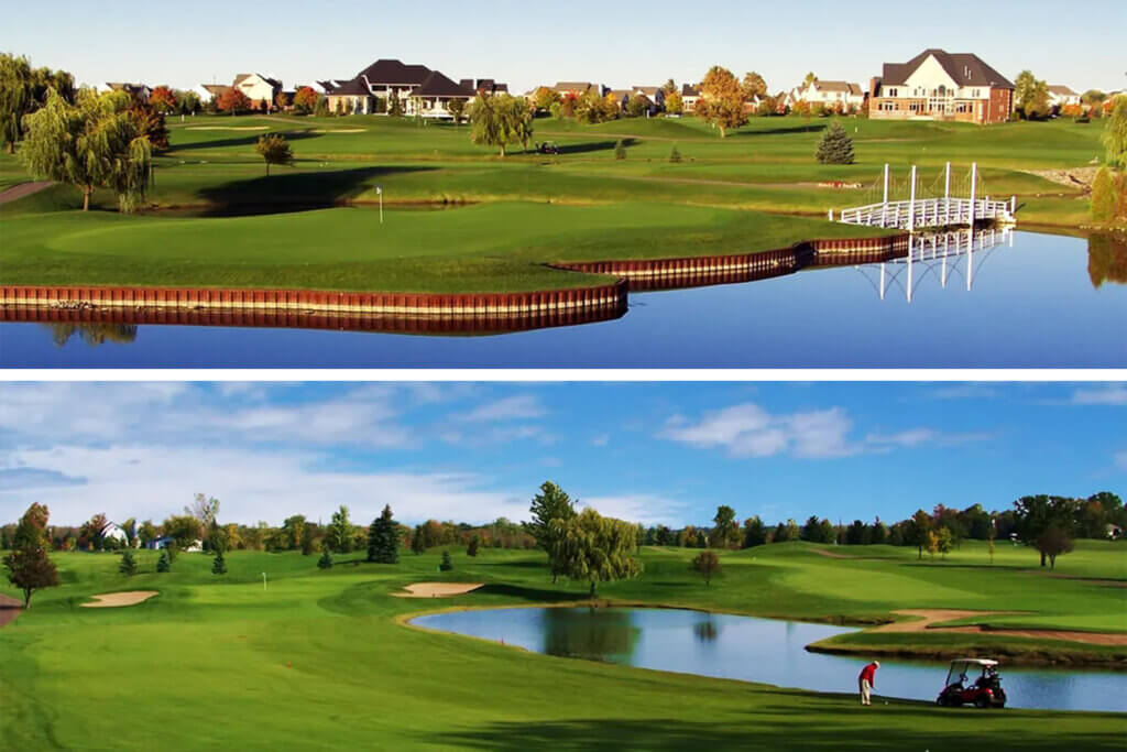 The club is a 27-hole daily-fee facility designed by Bill Newcomb which opened in 1991. The course has three different nine-hole layouts called the North, South and West course. The distinctive layout allows Tanglewood to host amateur events and outings, of which there have been many throughout its history, including multiple Golf Association of Michigan championships and competitions as well as several Celebrity Pro-Ams. One of the standout features of the course is the design of the sixth and seventh holes: the green for the sixth hole is shaped like the lower peninsula of Michigan which connects to the tee box for the seventh hole, which is shaped like the upper peninsula. The two features are connected by a replica of the Mackinac Bridge, mirroring the real-life bridge connecting the two peninsulas.