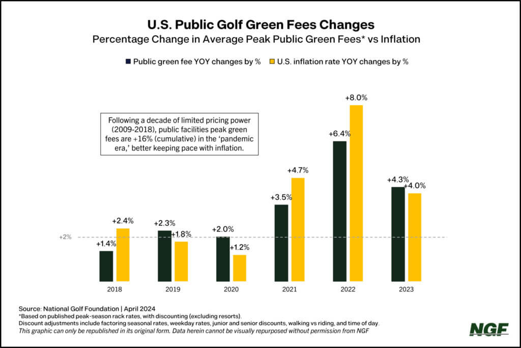NGF reports that in the last four years, the number of rounds played annually sits 12% above the 10-year pre-pandemic average. In that same timeframe, green fees increased 16% cumulatively. Those increases came after 10 years of oversupply and saw the prices chasing after U.S. inflation rates.